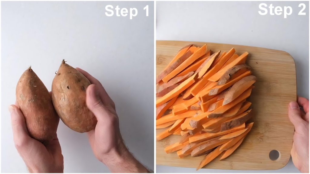 Step 2: After selecting them, peel the sweet potatoes and trim off the tapered ends. Set those pieces aside for another dish. Next, slice each sweet potato in half lengthwise. This step creates a flat surface, making it easier to lay them securely on the cutting board to cut into long, even strips.