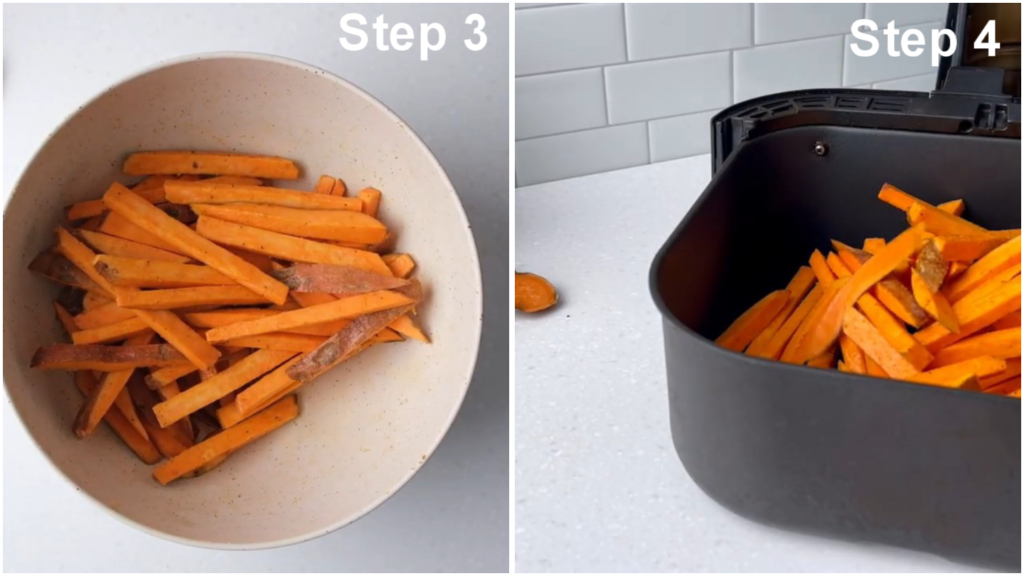 Step 3: After slicing the sweet potatoes, the next step is cooking them in the air fryer. For optimal texture, most air fryer models benefit from preheating. While the unit heats up, you can prepare the seasoning mix for the sweet potato fries.