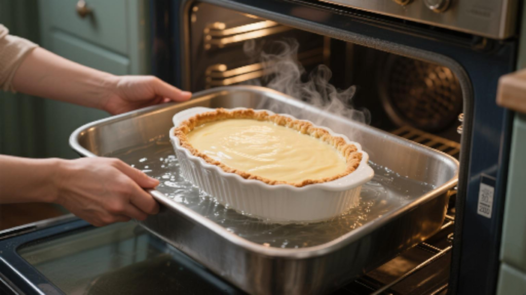- My top is browning too fast in the water bath. Tent the dish loosely with a sheet of foil. Remove it for the final 10 minutes of baking.
