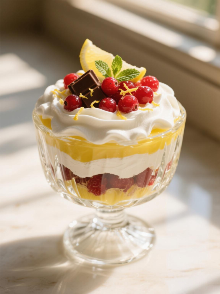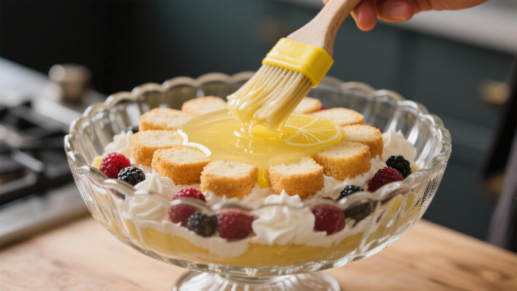 A trifle fails when its layers collapse into a watery pool. This recipe controls hydration and fat. The Genoese sponge is lean, with a tight crumb that soaks up limoncello syrup without disintegrating. The homemade lemon curd uses whole eggs and precise thermal cooking for a set that’s firm enough to layer, but lush on the tongue. The syllabub is stabilized not with gelatin, but with a careful ratio of cream to acidic lemon juice, which slightly thickens the proteins.
