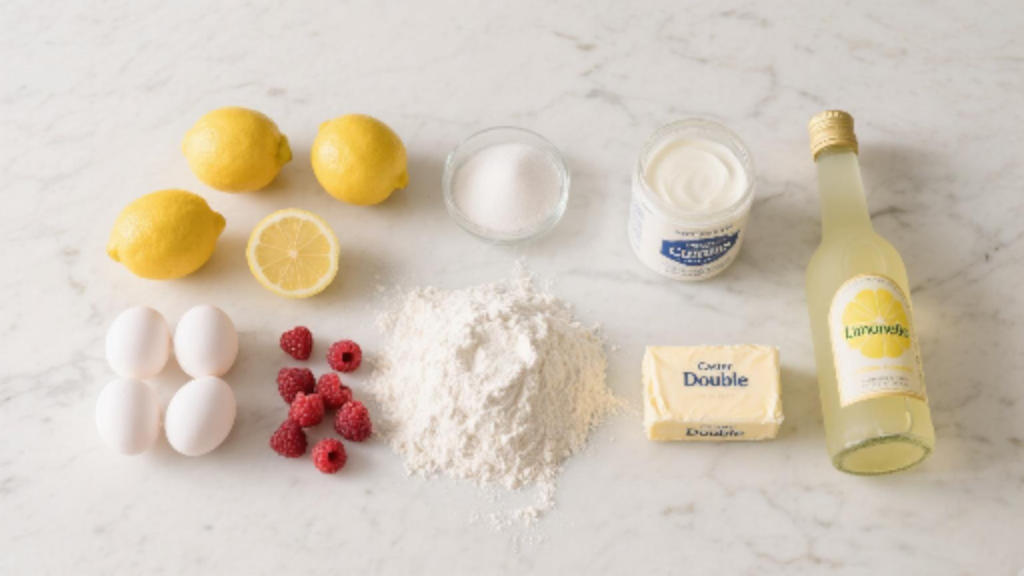 - For the Syrup & Assembly: 100ml limoncello liqueur (3.4 fl oz), 2 tbsp icing sugar (confectioner’s sugar), 300g fresh raspberries (10.5 oz).
