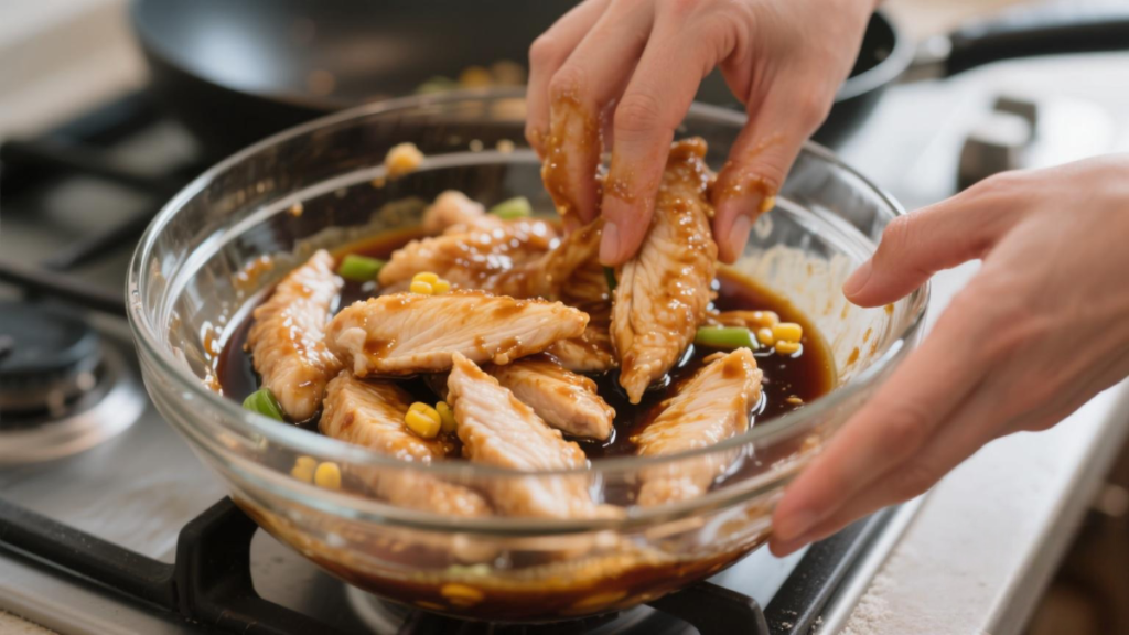 Combine the chicken strips with the 1 tbsp light soy, rice wine, sesame oil, and 1 tsp cornflour in a bowl. Massage for 30 seconds until tacky. Set aside for 15 minutes. The cornflour forms a protective coating for tender chicken.