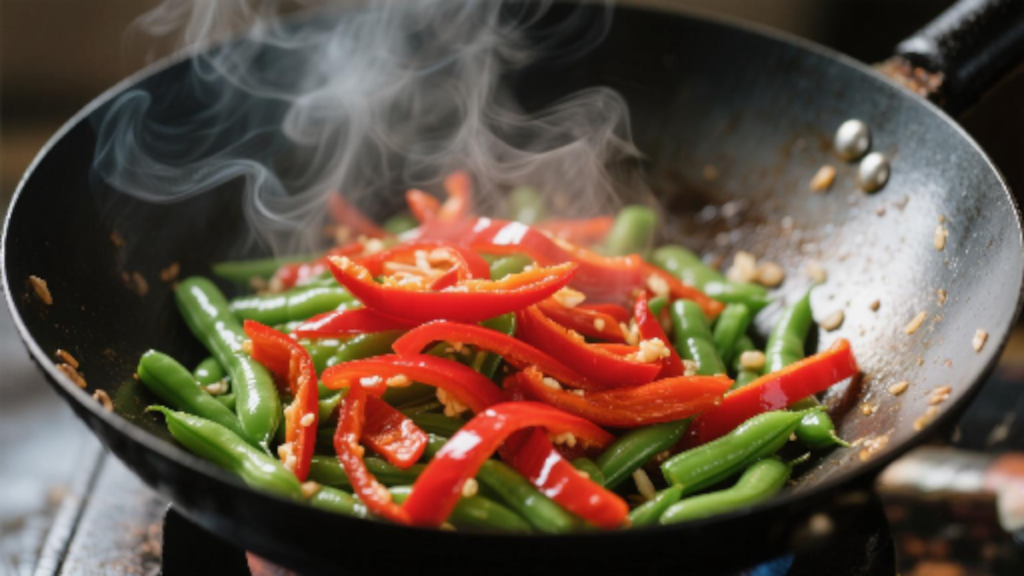 A proper stir-fry is an exercise in violent, rapid evaporation. Your wok or pan must be smoking hot before any ingredient touches it. This instant sear creates the Maillard reaction—those complex, savoury flavours—and seals in juices. Adding cool, wet ingredients lowers the pan temperature dramatically, leading to stewing. We combat this by patting every ingredient completely dry before cooking. The sauce is thickened with a cornflour slurry, which creates a stable, clingy gloss that won’t separate or become watery.