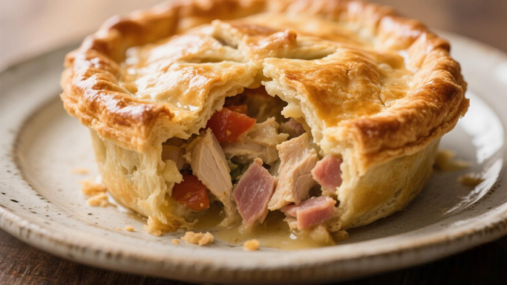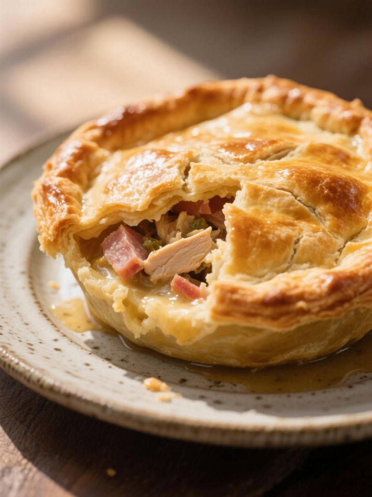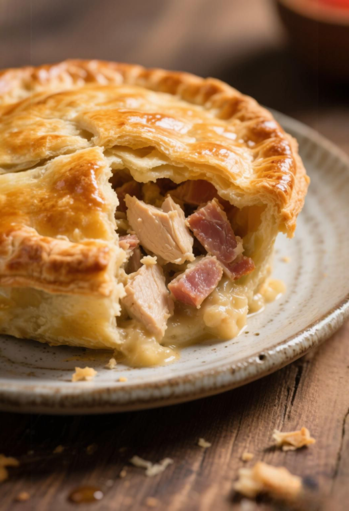 That first cut through the lid is the moment of truth. The golden, all-butter puff pastry shatters with a clean, crisp crack. Beneath it, a plume of fragrant steam escapes, carrying the scent of tarragon and white wine. You reveal a filling that is piping hot, creamy, and absolutely packed with generous chunks of tender chicken and savoury smoked ham.