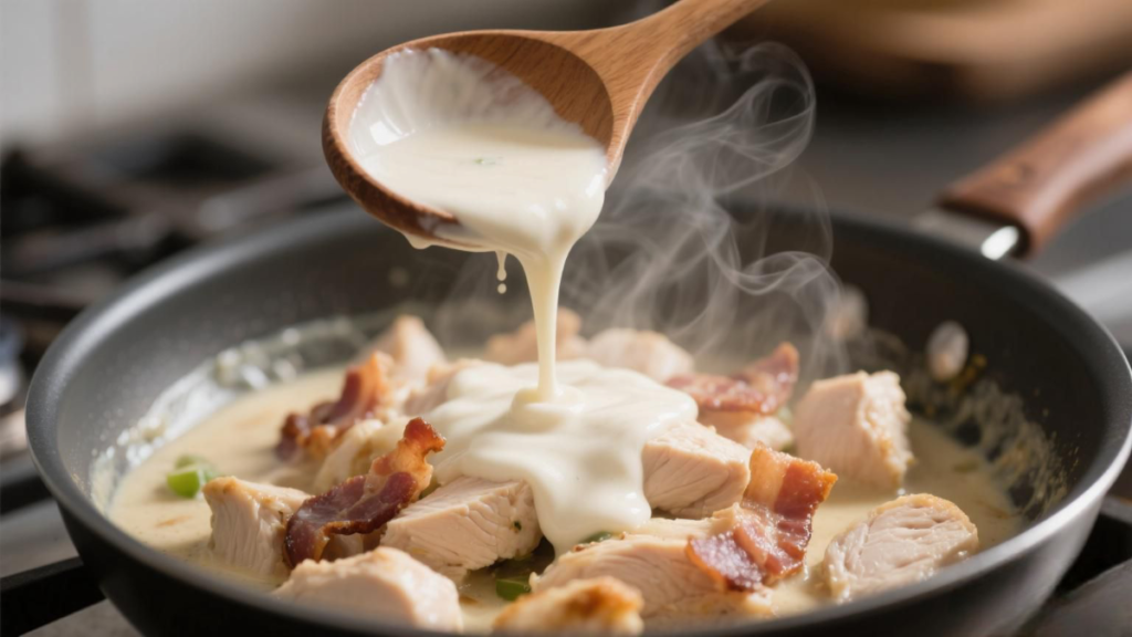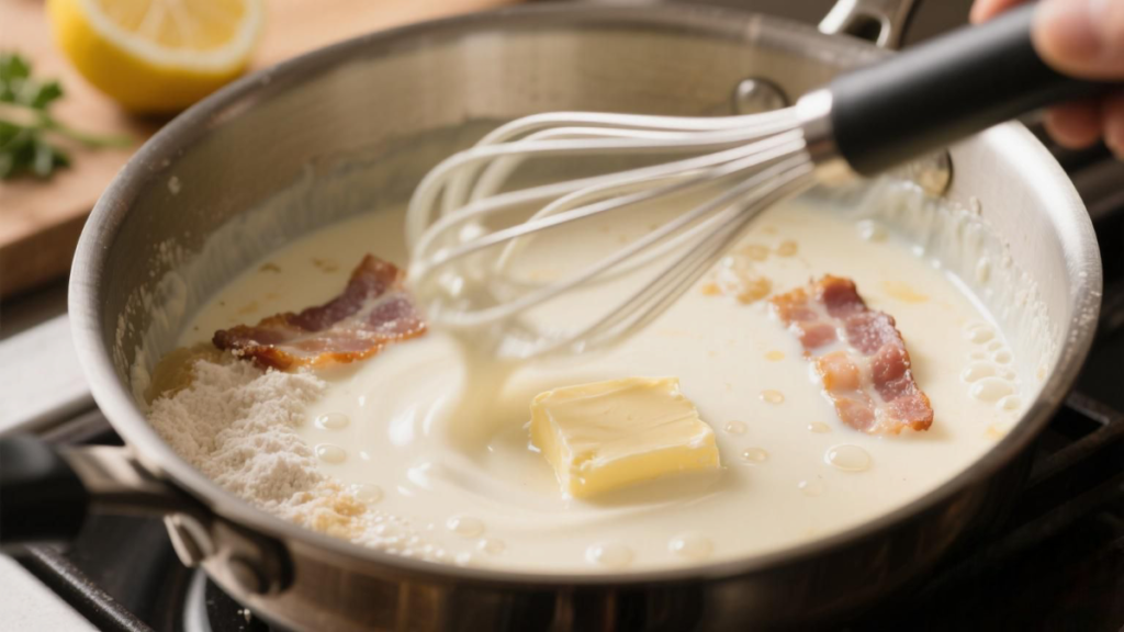 Stir the flour into the pan with the onions and bacon. Cook, stirring constantly, for 1-2 minutes. This cooks out the raw flour taste. Take the pan off the heat and gradually whisk in the milk until you have a smooth paste, then whisk in the reserved poaching liquid (your stock) and the measured chicken stock. Return the pan to the heat and bring to a gentle boil, whisking continuously. As it heats, the sauce will thicken to a smooth, glossy coating consistency. Season with salt and plenty of black pepper.